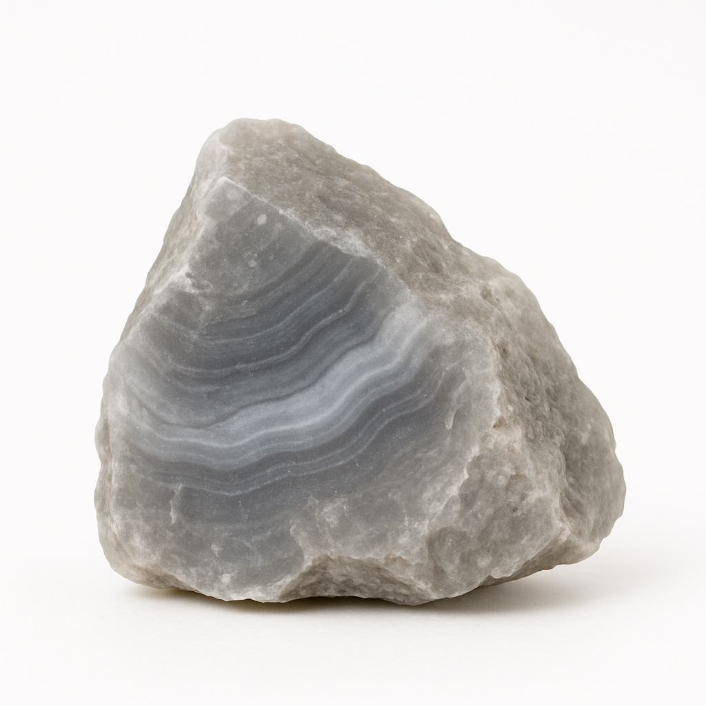Quartz microcristallin (calcédoine) déposé en couches concentriques dans des cavités volcaniques. Les variations de gris proviennent d’inclusions et de fines bandes de croissance.