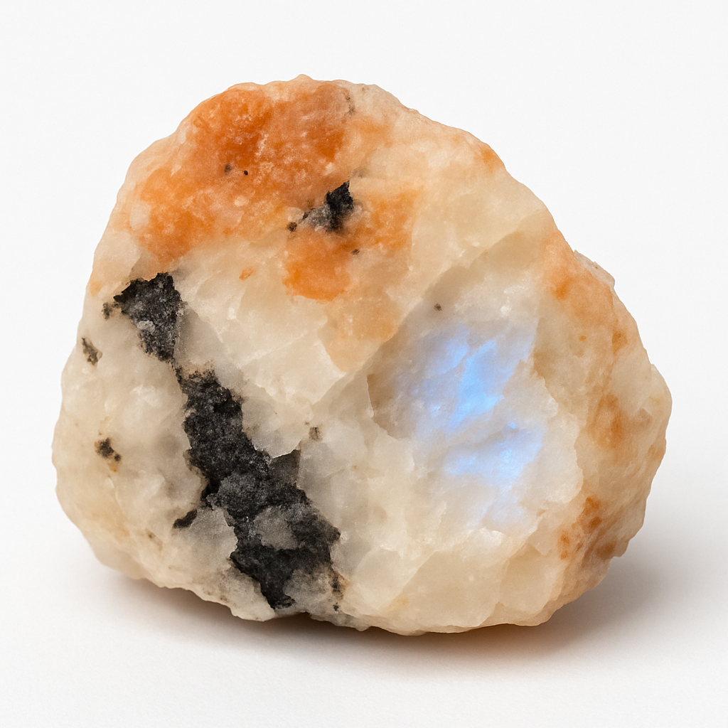 🌍 Aussi appelée “Rainbow Moonstone”, il s’agit en réalité d’une labradorite blanche : base blanche/translucide révélant des reflets bleus, verts, dorés selon la lumière (labradorescence).